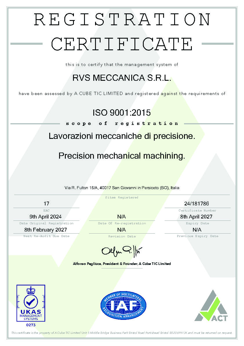 RVS meccanica è un'azienda certificata ISO 9001:2015 per lavorazioni meccaniche di precisione per componenti meccacinici ed idraulici.